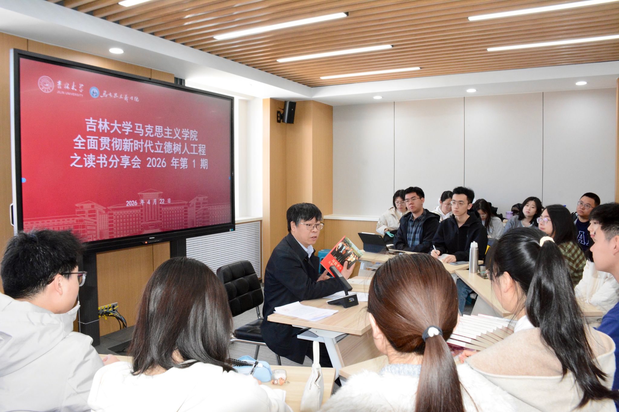 吴宏政结合自身经历分享了《习近平与大学生朋友们》的阅读体会。他认为,该书以生动的故事和亲历体验,展现了习近平总书记与大学生交流交往的真挚情谊,可读性强,是学习习近平新时代中国特色社会主义思想的鲜活教材,并勉励同学们认真研读、用心体悟。